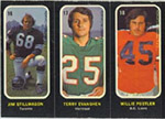 1972 O-Pee-Chee CANADIAN FOOTBALL LEAGUE TRIO STICKER INSERTS The 1972 O-Pee-Chee CFL Trio Sticker Set consists of 24 panels. The panel is standard card size and is made up of 3 peel-off stickers with a player on each sticker. The backs are blank. Each player has an individual number. These panels were inserted in the 1972 packs. The key panel in the Set is Joe Theisman. 1972 OPC CFL Football Cards IMPORTANT INFORMATION ABOUT ORDERING, AND FAQ Return to the main football page Return to the main CFL football page  |